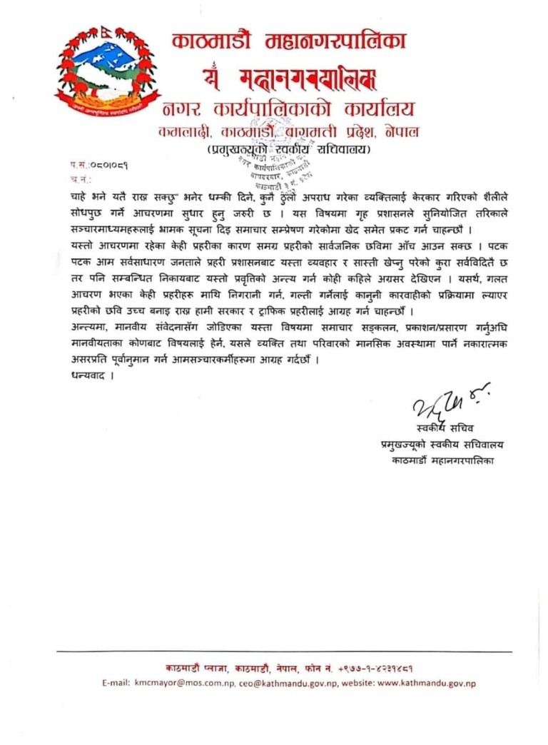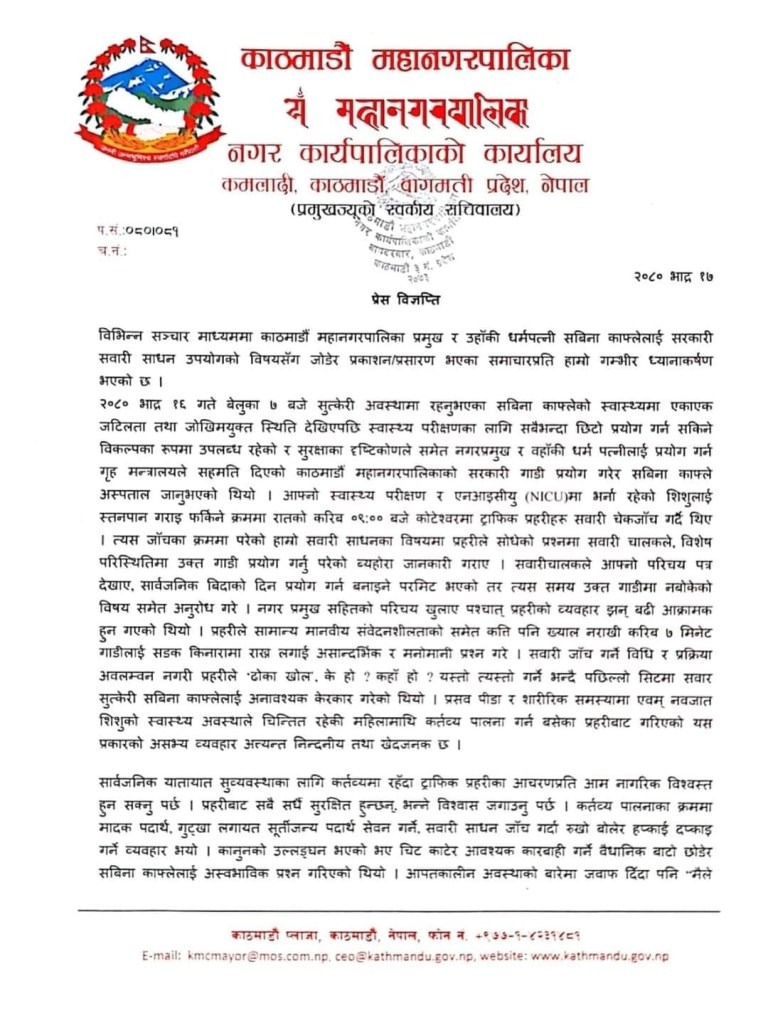 १७ भदौ, काठमाडौँ । काठमाडौँ महानगरपालिकाका मेयर बालेन्द्र शाह (बालेन) को स्वकीय सचिवालयले श्रीमती सविना काफ्लेले सरकारी सवारी साधन उपयोग गरेको विषय सँग जोडेर प्रकाशन र प्रसारण भएका समाचार प्रति ध्यानाकर्षण भएको जनाएको छ ।