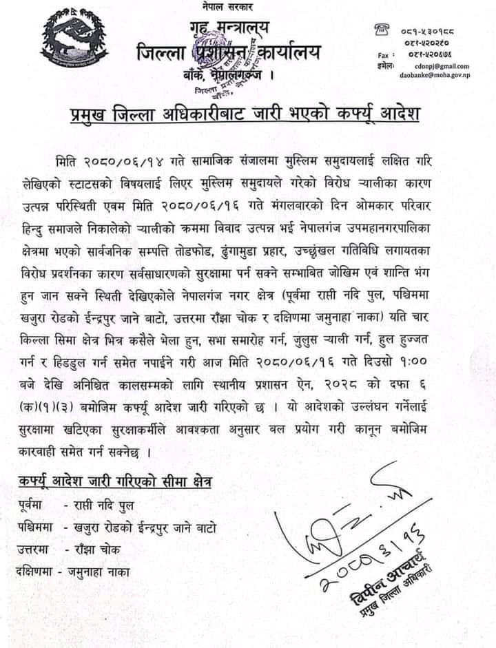 असोज १४ गते सामाजिक संजालमा मुस्लिम समुदायलाई लक्षित गरि लेखिएको स्टाटसको विषयलाई लिएर मुस्लिम समुदायले गरेको विरोध र्यालीका कारण उत्पन्न परिस्थिती एवंम मंगलबार ओमकार परिवार हिन्दु समाजले र्याली निकाल्ने क्रममा विवाद उत्पन्न भएको जनाउदै जिल्ला प्रशासन कार्यालय बाँकेले कफ्र्यु आदेश गरेको छ ।