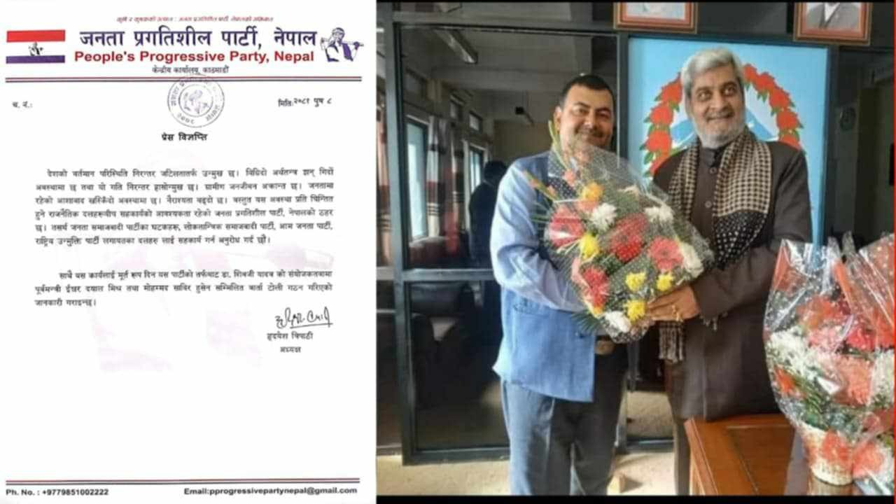 जनता प्रगतिशील पार्टी नेपालका राष्ट्रीय अध्यक्ष हृदयेश त्रिपाठी हस्ताक्षरित प्रेस विज्ञप्ति आज निकालिएको छ ।