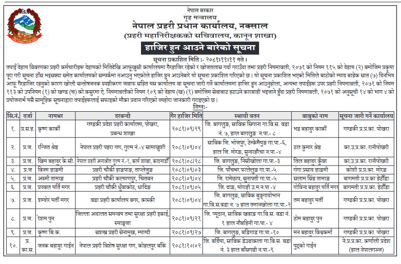 ११ फाल्गुन, काठमाडौँ । प्रहरी प्रधान कार्यालयले १० जना प्रहरी सम्पर्क विहीन भएको जनाउँदै हाजिर हुन आउने सम्बन्धी सूचना प्रकाशन गरेको छ ।