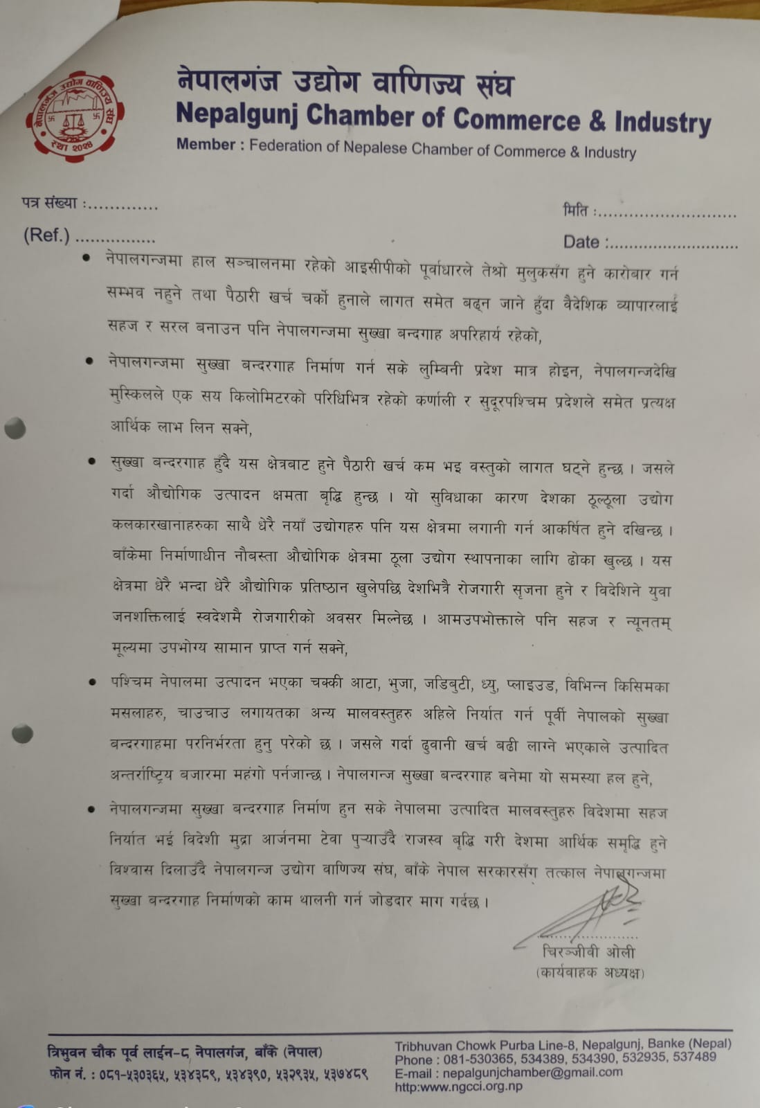 संघका कार्यवाहक अध्यक्ष ओलीद्वारा हस्ताक्षरित ज्ञापनपत्रमा नेपालगन्जको एकीकृत भन्सार जाँचचौकी (आइसीपी)लाई नै सुख्खा बन्दरगाहमा परिणत गरी वैदेशिक व्यापार व्यवसायलाई अभिवृद्धि गर्न भनिएको छ ।