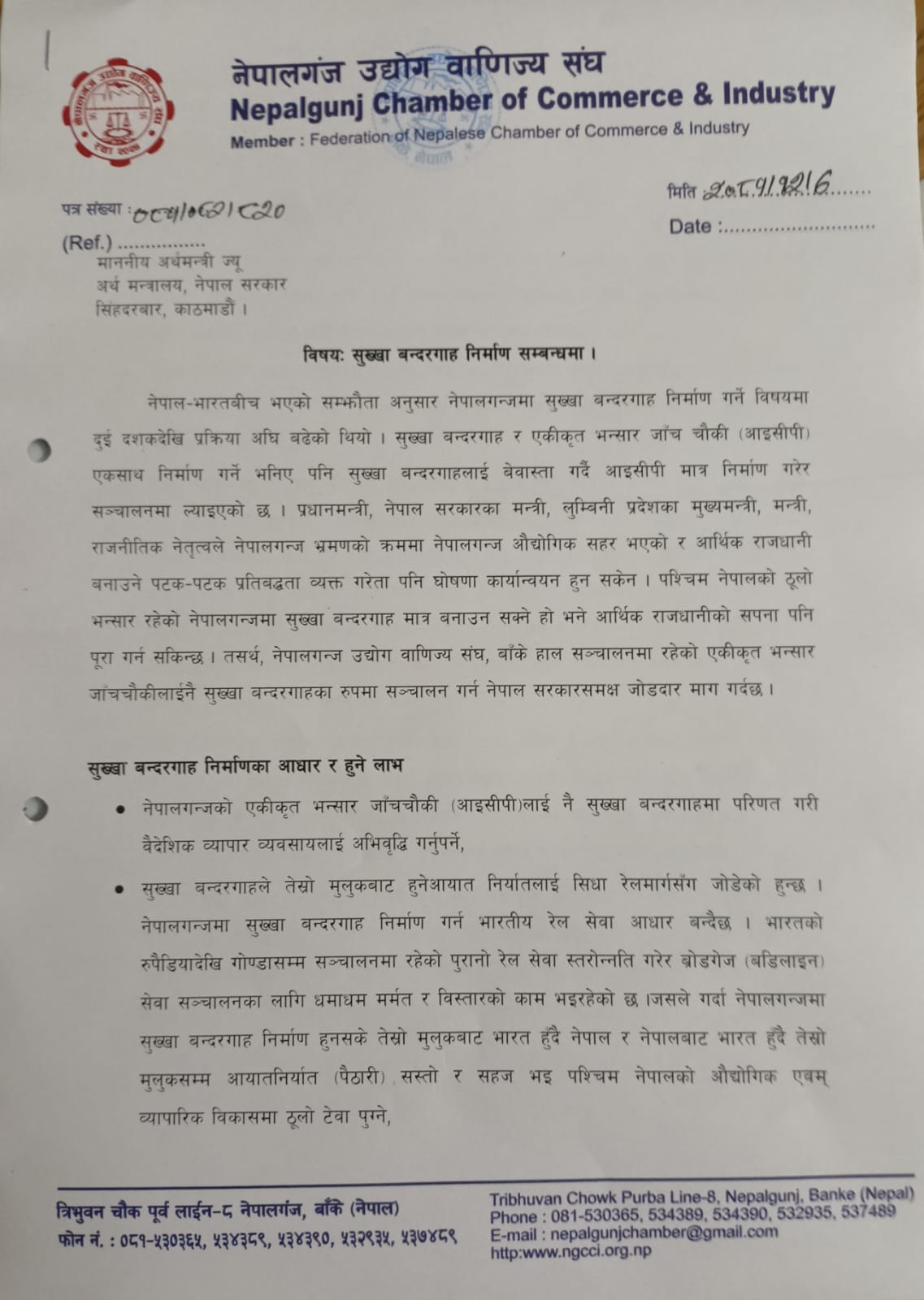 ‘नेपालगञ्जमा सुख्खा बन्दरगाह निर्माण हुनसके तेस्रोे मुलुुकबाट भारत हुँदै नेपाल र नेपालबाट भारत हुँदै तेस्रो मुलुकसम्म आयातनिर्यात (पैठारी) सस्तो र सहज भइ पश्चिम नेपालको औद्योगिक एवम् व्यापारिक विकासमा ठूलो टेवा पुग्नेछ’, ज्ञापन पत्रमा भनिएको छ, ‘नेपालगञ्जमा हाल सञ्चालनमा रहेको आइसीपीको पूर्वाधारले तेश्रो मुलुकसँग हुने कारोबार गर्न सम्भव नहुने तथा पैठारी खर्च चर्को हुनाले लागत समेत बढ्न जाने हुँदा वैदेशिक व्यापारलाई सहज र सरल बनाउन पनि नेपालगन्जमा सुख्खा बन्दगाह अपरिहार्य रहेको छ ।’