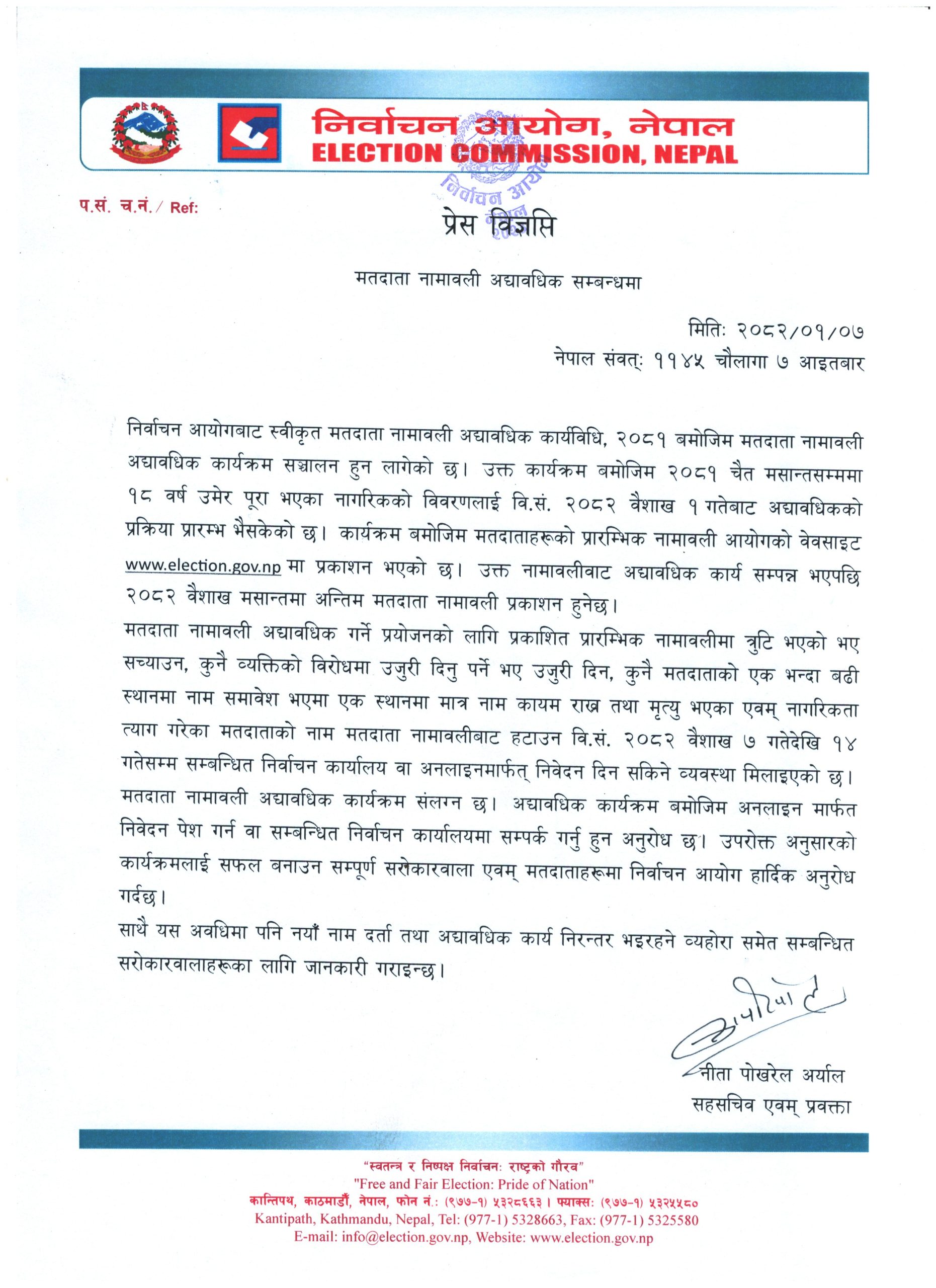 मतदाता नामावली अद्यावधिक गर्ने प्रयोजनको लागि प्रकाशित प्रारम्भिक नामावलीमा त्रुटि भएको भए सच्याउन, कुनै व्यक्तिको विरोधमा उजुरी दिनु पर्ने भए उजुरी दिन, कुनै मतदाताको एक भन्दा बढी स्थानमा नाम समावेश भएमा एक स्थानमा मात्र नाम कायम राख्न तथा मृत्यु भएका एवम् नागरिकता त्याग गरेका मतदाताको नाम मतदाता नामावलीबाट हटाउन वैशाख ७ गतेदेखि १४ गतेसम्म सम्बन्धित निर्वाचन कार्यालय वा अनलाइन मार्फत् निवेदन दिन सकिने व्यवस्था मिलाइएको आयोगकी सहसचिव एवम् प्रवक्ता नीता पोखरेल अर्यालले जानकारी गराइन ।