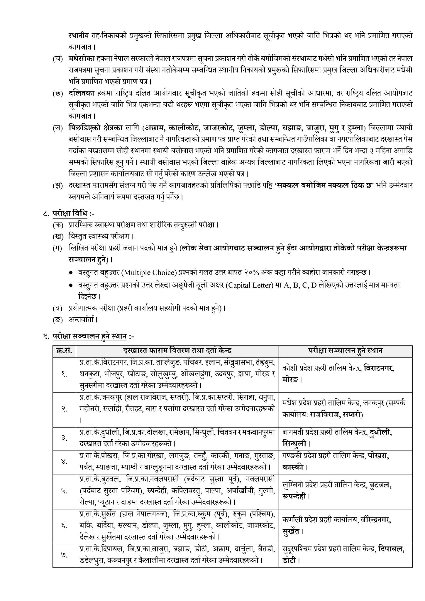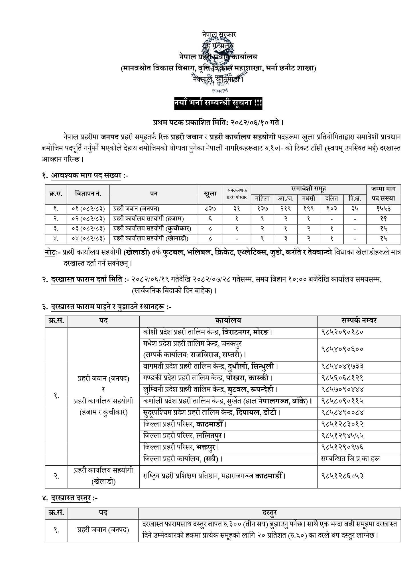 जनपद प्रहरी जवानतर्फ एक हजार पाँचसय ५३, प्रहरी कार्यालय सहयोगी हजाम तर्फ ११, कुचीकारतर्फ १५ र खेलाडीतर्फ १५ पदहरूमा खुला प्रतियोगिताबाट समावेशी प्रावधान बमोजिम पदपूर्ति गरिने छ ।