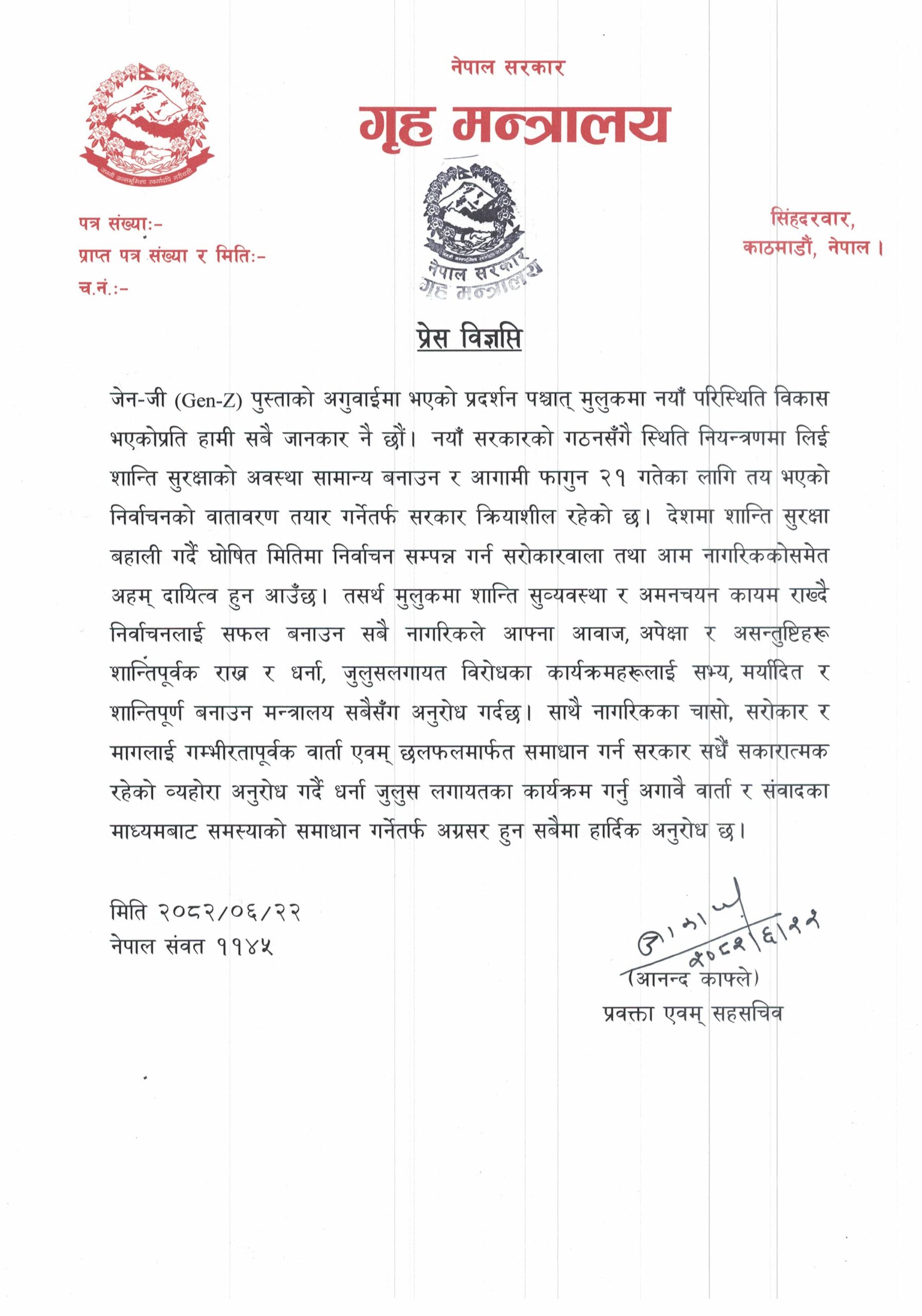 मन्त्रालयले आज एक विज्ञप्ति जारी गर्दै नागरिकले आफ्ना आवाज, अपेक्षा र असन्तुष्टिहरू शान्तिपूर्वक राख्न भनेको छ । जेनजीको अगुवाइमा भएको प्रदर्शन पश्चात् मुलुकमा नयाँ परिस्थिति विकास भएको मन्त्रालयले जनाएको छ ।