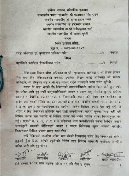 आदेशमा राष्ट्रपति कार्यालय सहितका बाँकी प्रतिवादीलाई सात दिनभित्र लिखित जवाफ पेस गर्न भनिएको छ ।