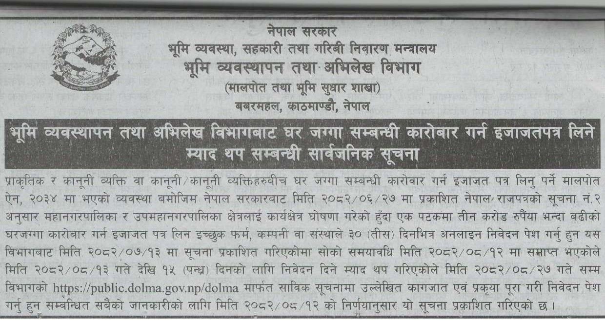 १५ मंसिर, काठमाडौँ । घर जग्गा सम्बन्धी कारोबार गर्न इजाजत पत्र लिन चाहने फर्म, कम्पनी वा संस्थालाई आवेदनका लागि भूमि व्यवस्थापन तथा अभिलेख विभागले म्याद थप गरेको छ ।
